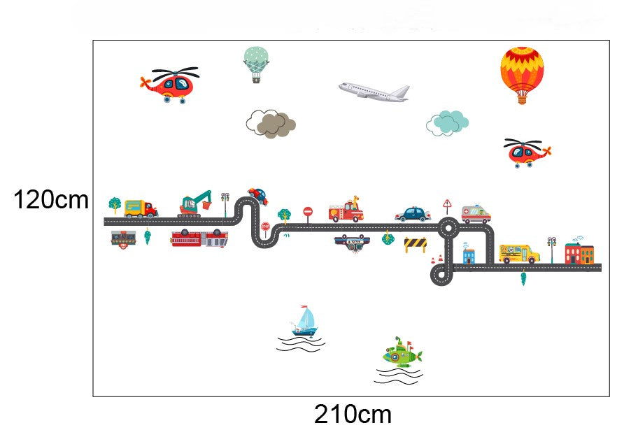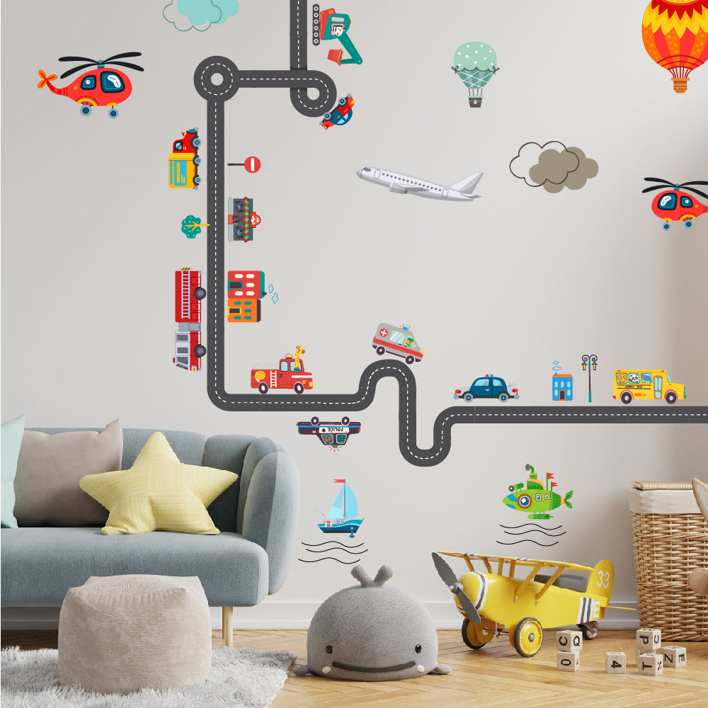 Luo lastenhuoneeseen värikäs ja eläväinen maailma tällä superisolla 210 × 120 cm liikenneaiheisella seinätarralla! Tarrakokonaisuus sisältää hauskan ja pitkän autoradan, sekä paljon yksityiskohtaisia kuvia autoista, paloautosta, bussista, helikoptereista, lentokoneesta, kuumailmapallosta, veneistä ja rakennuksista. Tämä seinätarra muuttaa huoneen hetkessä seikkailulliseksi liikennekaupungiksi, jossa mielikuvitus pääsee kunnolla vauhtiin.